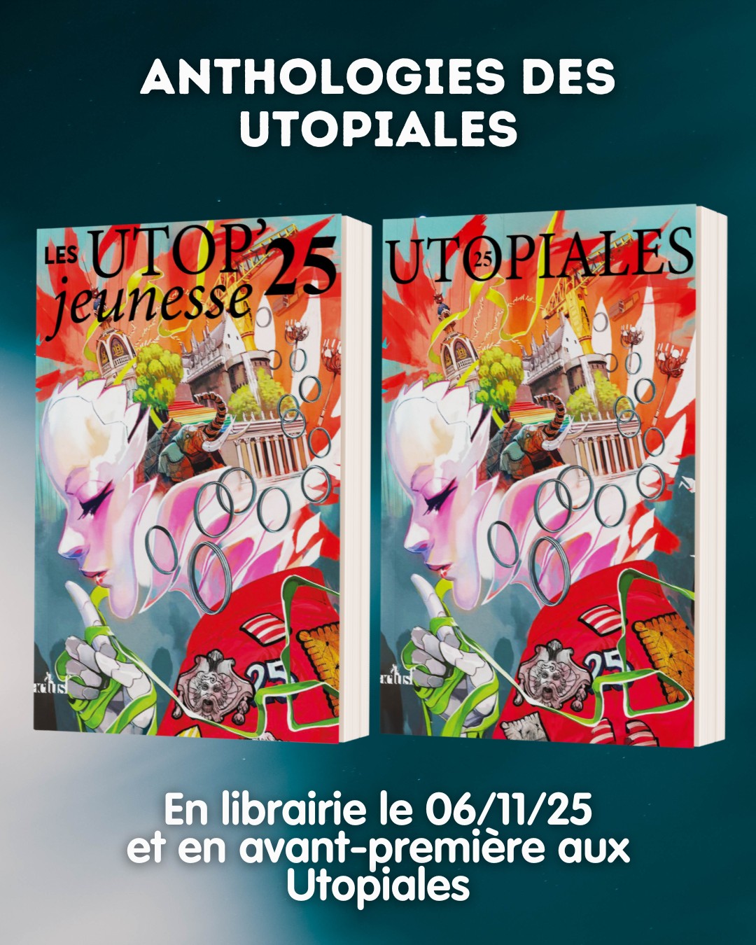 Nous sommes ravi.e.s de vous dévoiler la couverture de nos deux anthologies des Utopiales 2025 à retrouver en librairie le 6 novembre et en avant-première au festival des Utopiales qui aura lieu à Nantes du 30 octobre au 2 novembre.